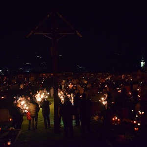 Am 1. November war es um 19 Uhr wieder so weit. Alle anwesenden Pfarrbewohner hatten Kerzen oder Laternen in der Hand. Unsere Chorleiterin hatte auch schon ihre Gitarre in der Hand und unser Kaplan war auch so weit. Und schon ging es los...ein steiler Aufstieg zum Friedhof.