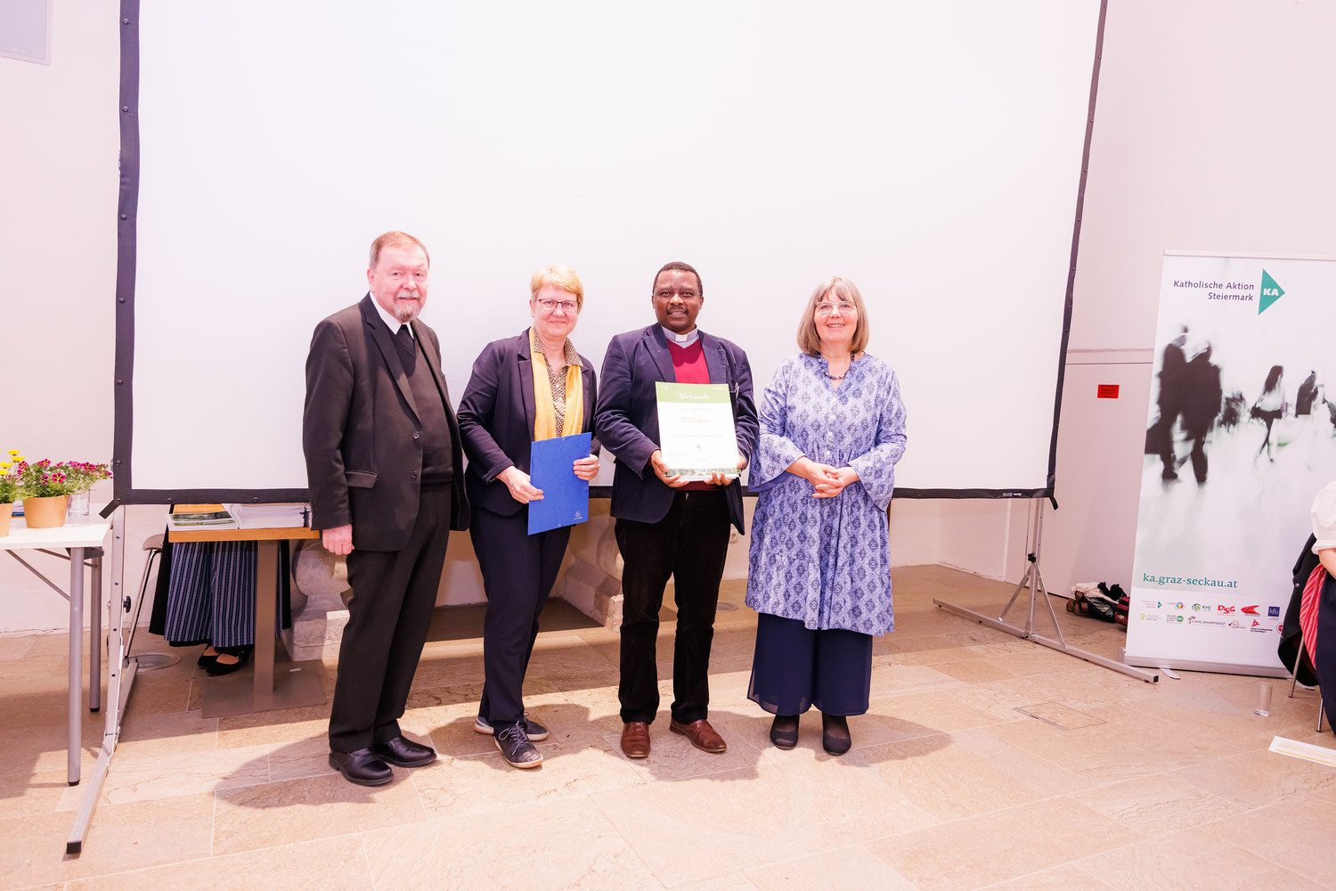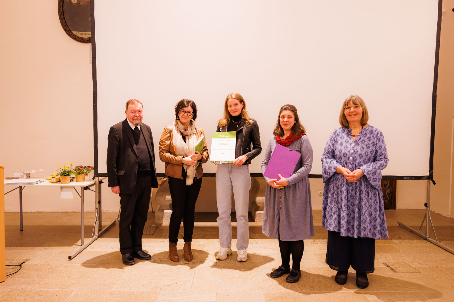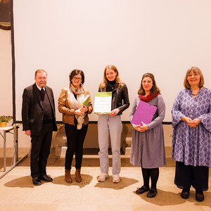 Hemma Opis-Pieber (links) und Generalvikar Erich Linhardt (rechts) mit Preisträger:innen vom Haus der Frauen. | Sonntagsblatt/Gerd Neuhold, Gerd Neuhold