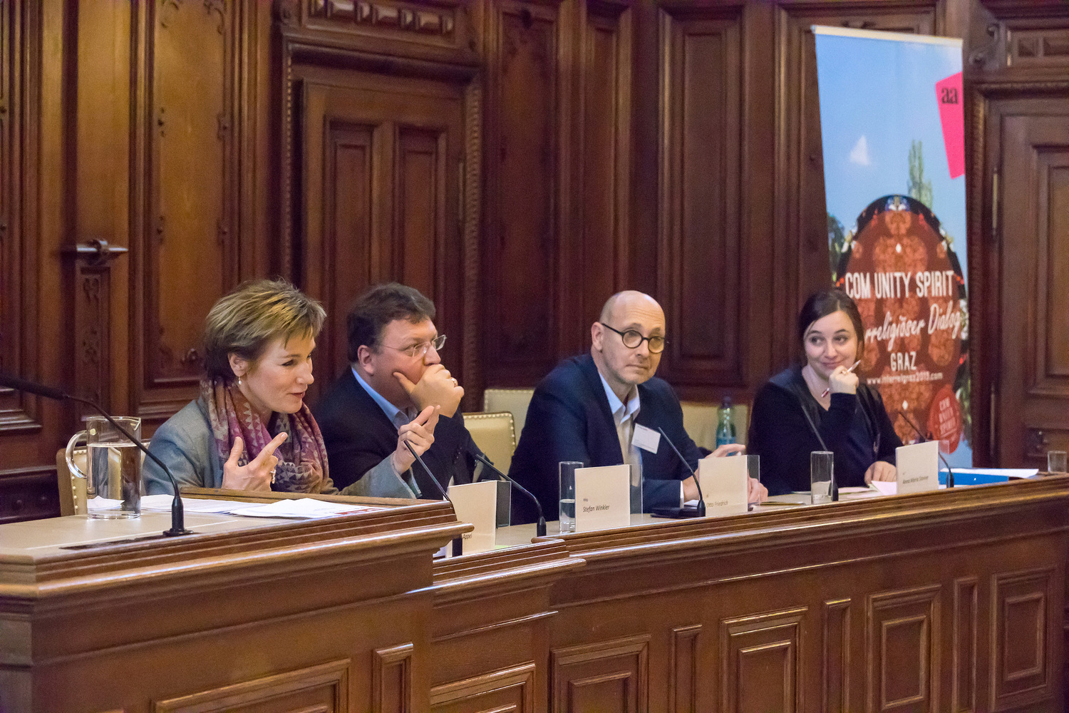 In der abschließenden Podiumsdiskussion unter der Moderation von Anna Maria Steiner erläuterte Doris Appel überzeugend die Verankerung des Themas Religion im ORF und dessen Bildungsauftrag. Stefan Winkler (Kleine Zeitung) betonte, dass Berichterstattung über Religion keinen anderen Kriterien zu folgen habe als in allen anderen Themenbereichen. Otto Friedrich (Die Furche) erklärte in aufschlussreicher Systematik, mit welchen Schwierigkeiten qualitativer Religionsjournalismus heute zu kämpfen hat.