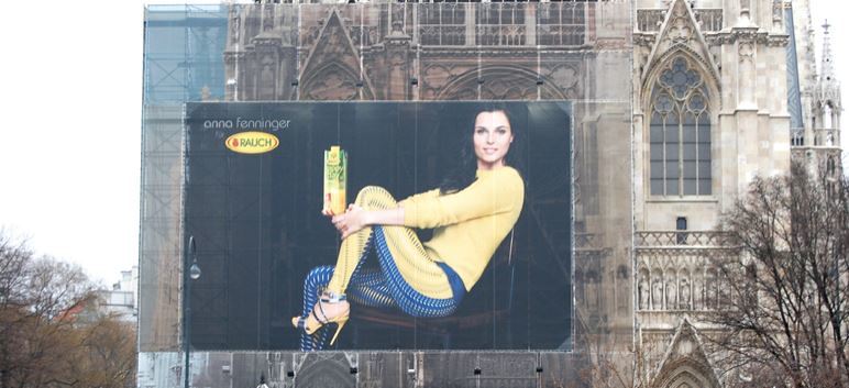 320 Quadratmeter misst die Werbefläche auf einem Gerüst vor der imposanten