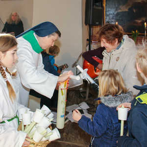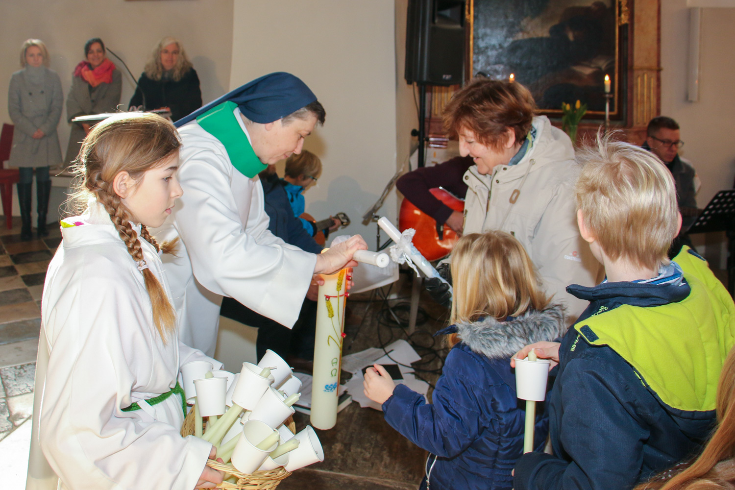 Drei Mütter sprachen bei der Predigt über die Themen aus dem Evangelium (Salz und Licht) und der Taufe. Bei der Taufe stehen drei Symbole im Mittelpunkt: Das Taufwasser, das weiße Kleid und die Taufkerze. Diese Taufkerze brachten die Kinder mit, um sie an der Osterkerze zu entzünden und so an ihre Taufe erinnert zu werden.