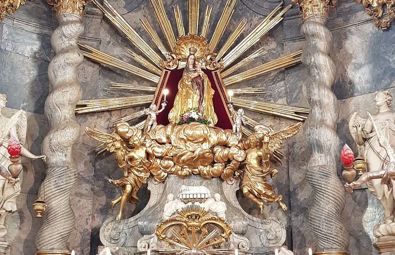 Der Hochaltar wurde von Lukas von Schramm geplant und bildet mit seinen mächtigen Marmorsäulen und dem großartigen Aufbau einen prächtigen Rahmen zur Altarmitte mit der Gnadenstatue.