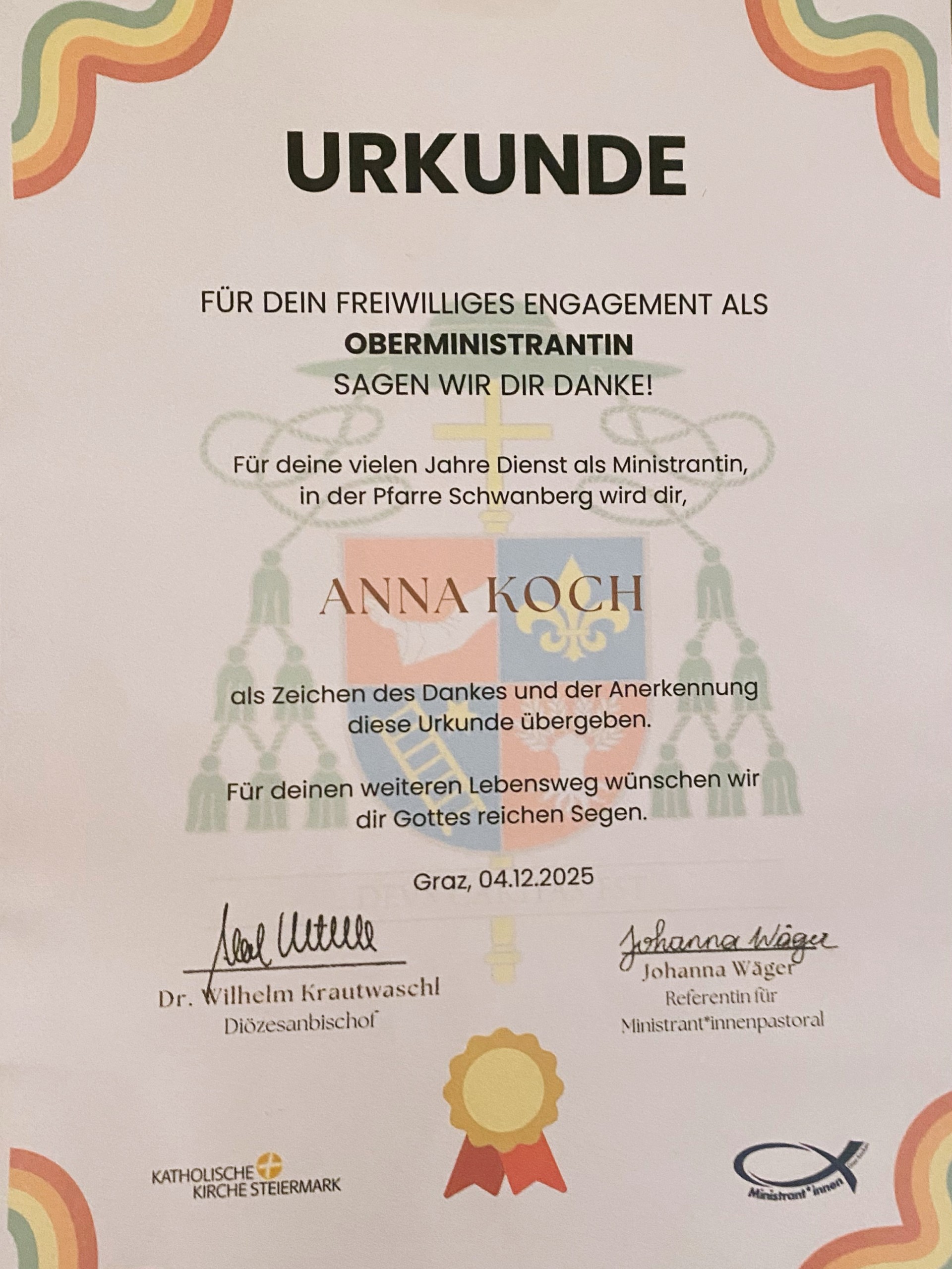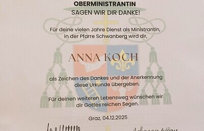 Am 4. Adventsonntag wurde unserer Ministrantenbeauftragten Anna Koch eine besondere Ehre zuteil: Diözesanbischof Dr. Wilhelm Krautwaschl stellte ihr eine Dankesurkunde für ihre langjährigen Verdienste um die Pfarre Schwanberg aus.