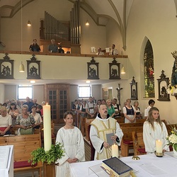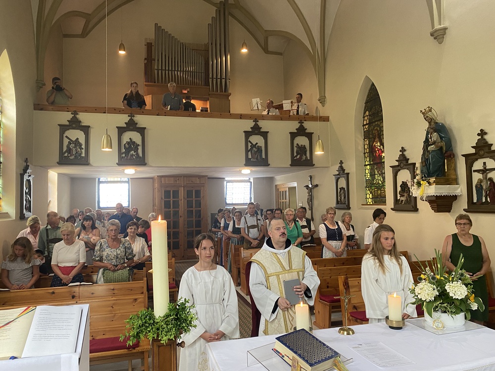 Pater Thomas feierte mit uns das Hochamt um 10:30 Uhr. Geige, Orgel und Trompeten brachten uns in feierliche Stimmung. Nach dem Gottesdienst spielte die Bergknappenkapelle Unterlaussa. Es gab alles von Schnitzel bis Schilcher Charmant.